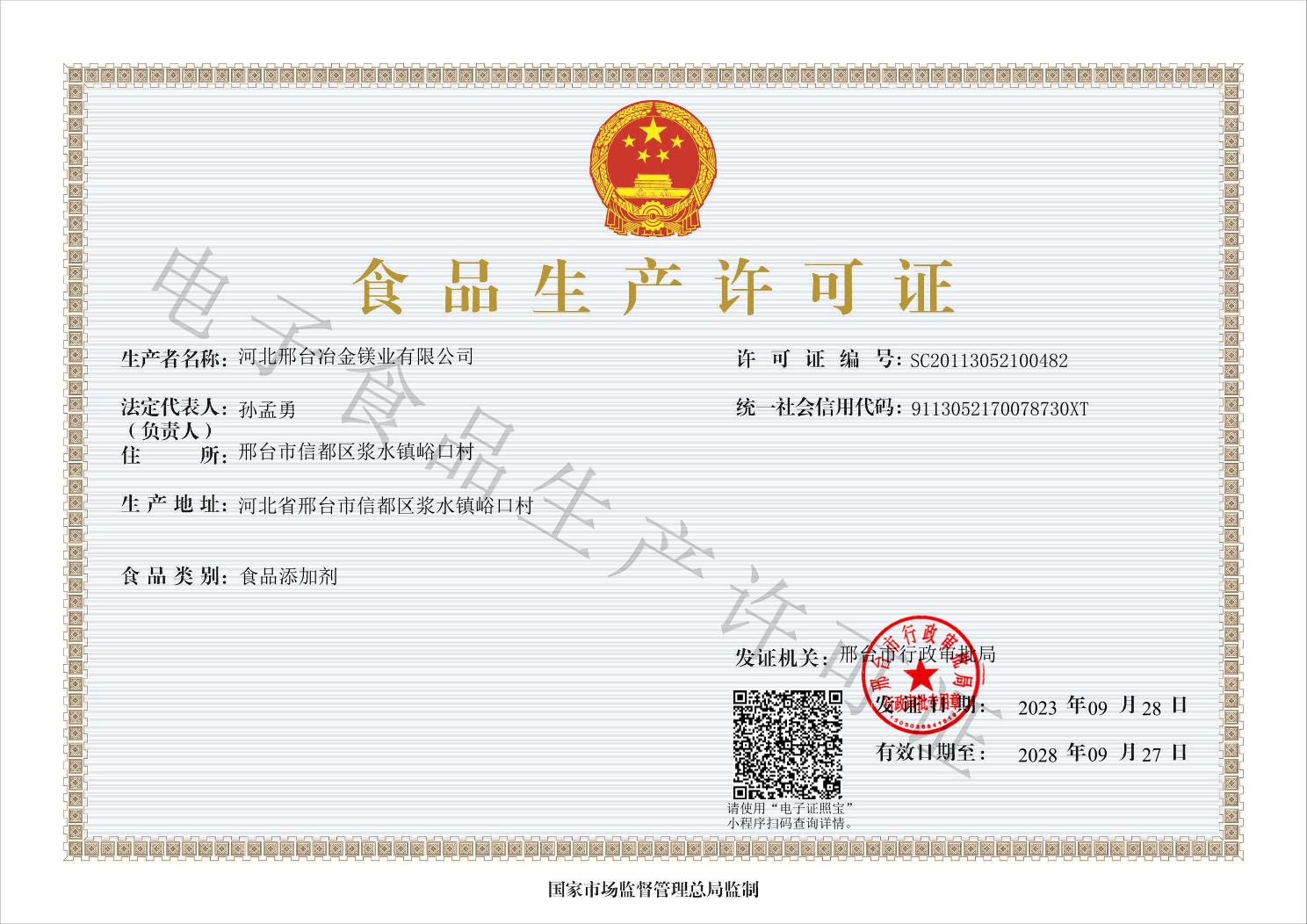 冶金鎂業食品生產許可證正本
