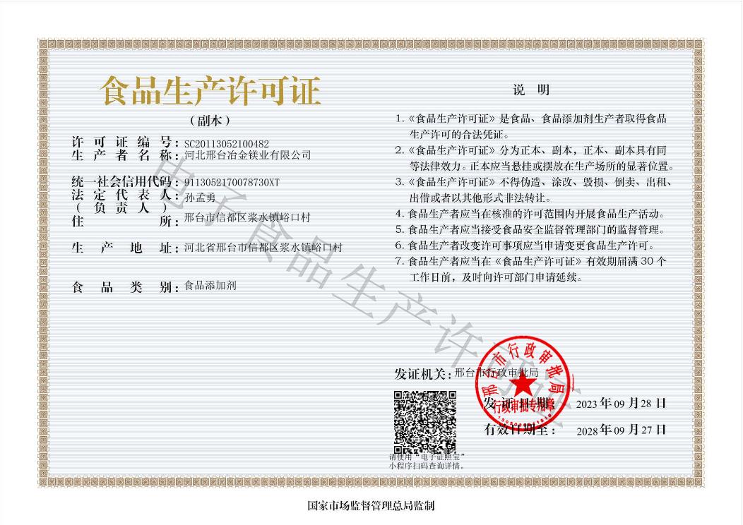 冶金鎂業食品生產許可證副本