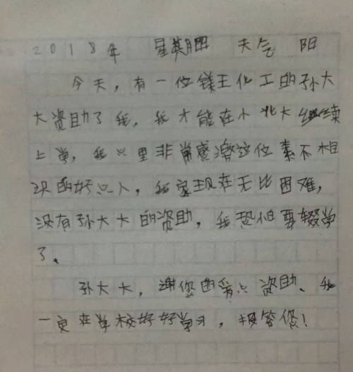 當(dāng)年8月份,紀(jì)某某和賈某某兩位學(xué)生分別以優(yōu)異的成績考入石家莊鐵道學(xué)院和河北工程技術(shù)學(xué)院。因家庭收入過低,無法支付昂貴的學(xué)費,家人一籌莫展,得知情況后,孫文董事長慷慨解囊,分別給予紀(jì)某某10000元、賈某某6000元的資助。受助家長激動地說,真不知道怎么感謝董事長的恩情,兩位學(xué)生表示,一定不辜負(fù)孫文董事長的愛心和厚望,努力學(xué)習(xí),用優(yōu)異的成績回報社會。