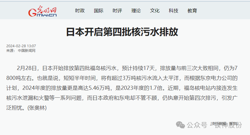 去年八月份以來,由于日本福島核電站的事故,大量的核污水被排放到海中,使得海水中的放射性物質(zhì)濃度大幅超標。而且日本東電公司對排海的核污水幾乎沒有處理,造成排放的核污水中放射性物質(zhì)不是“簡單”的氚,更有銫、镅、鍶等這類半衰期(既輻射達到當前輻射劑量一半的時間)超長的元素。