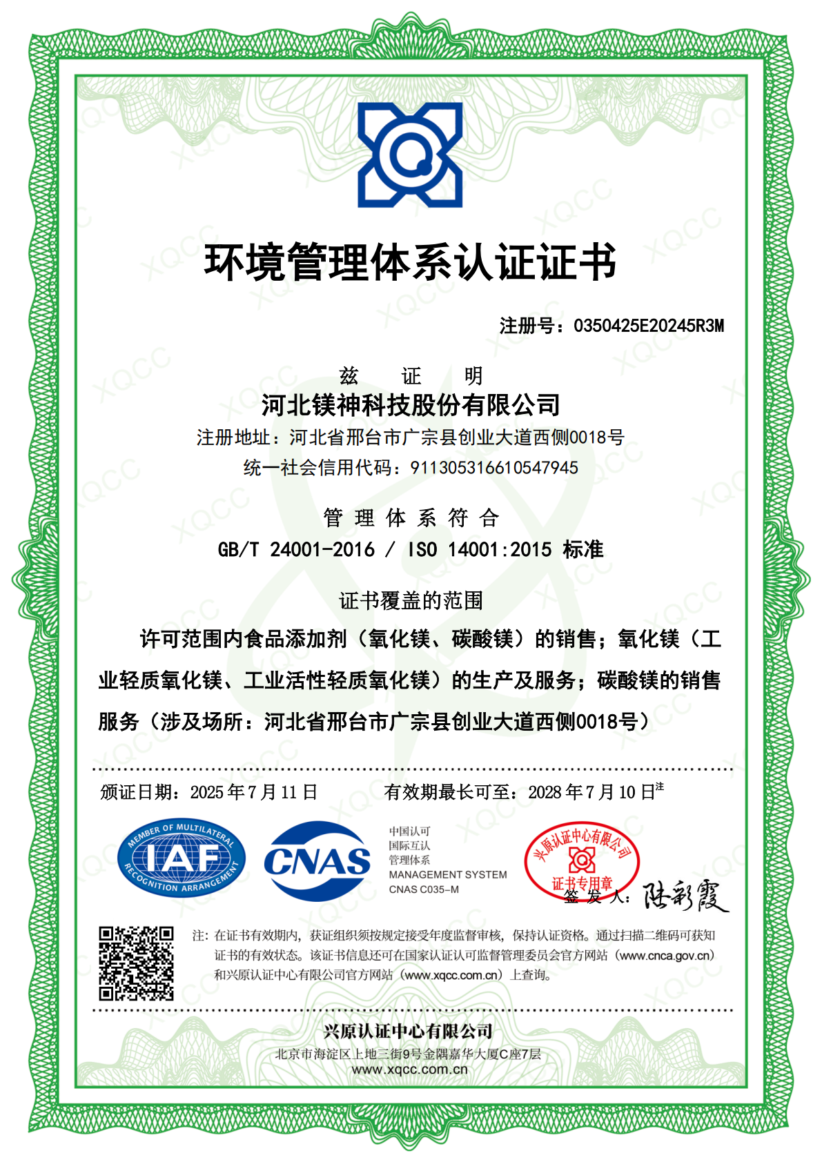 環境管理體系認證證書